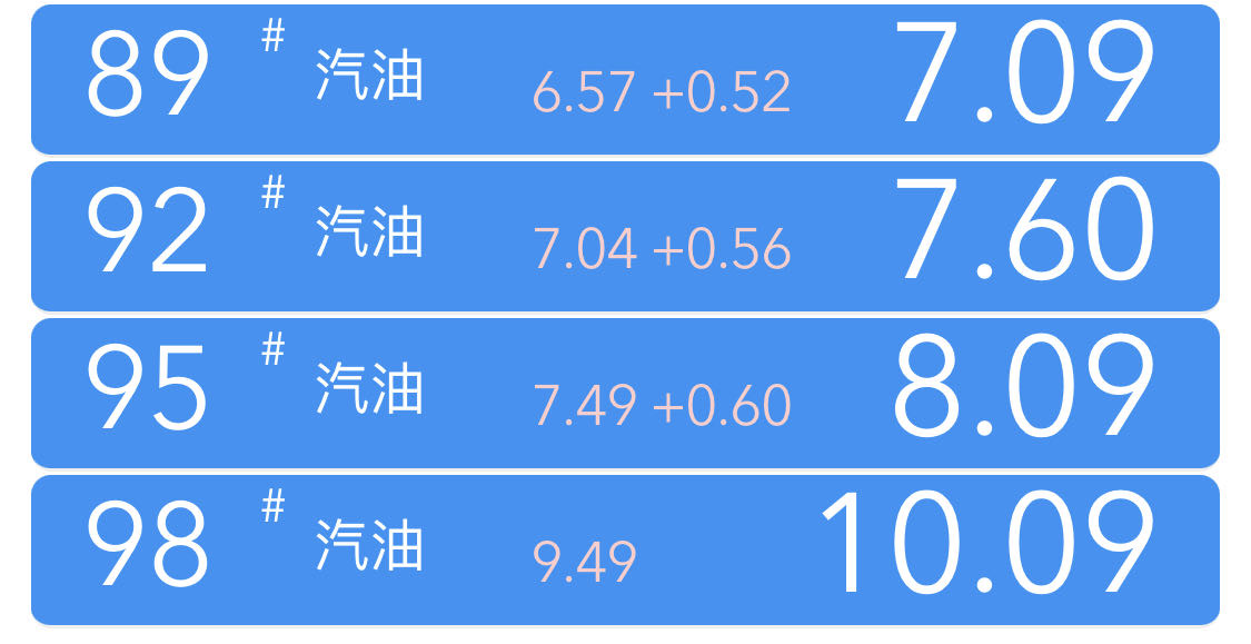 其中92汽油上涨0.55-0.57元/升,